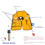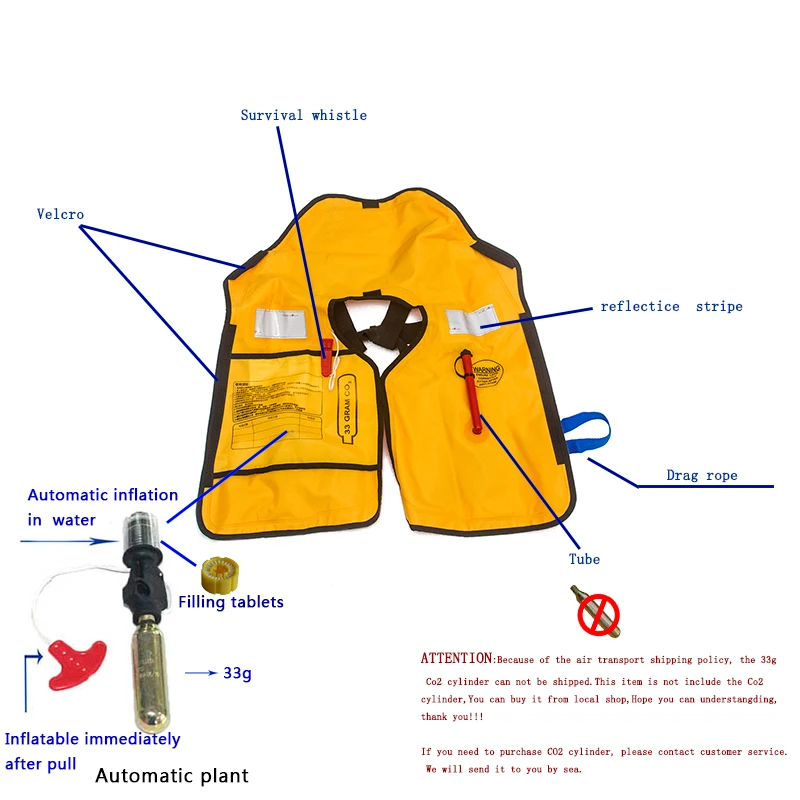 1. Cuando lo use por primera vez, no use la boca en un chaleco salvavidas inflable, en caso de que el dispositivo de carga automática tenga que funcionar.Es muy peligroso porque el chaleco salvavidas se bailará.