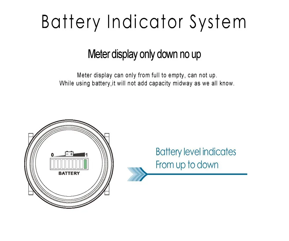 Indicador de batería adecuado para batería de almacenamiento de ácido de plomo, puede funcionar en baterías de 12/24V,36V,48/72V. Otro tipo de batería (como GEL, AGM, LiFeO4) necesita personalización, póngase en contacto con nuestro Centro de Servicio.
