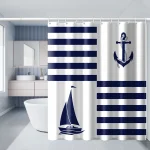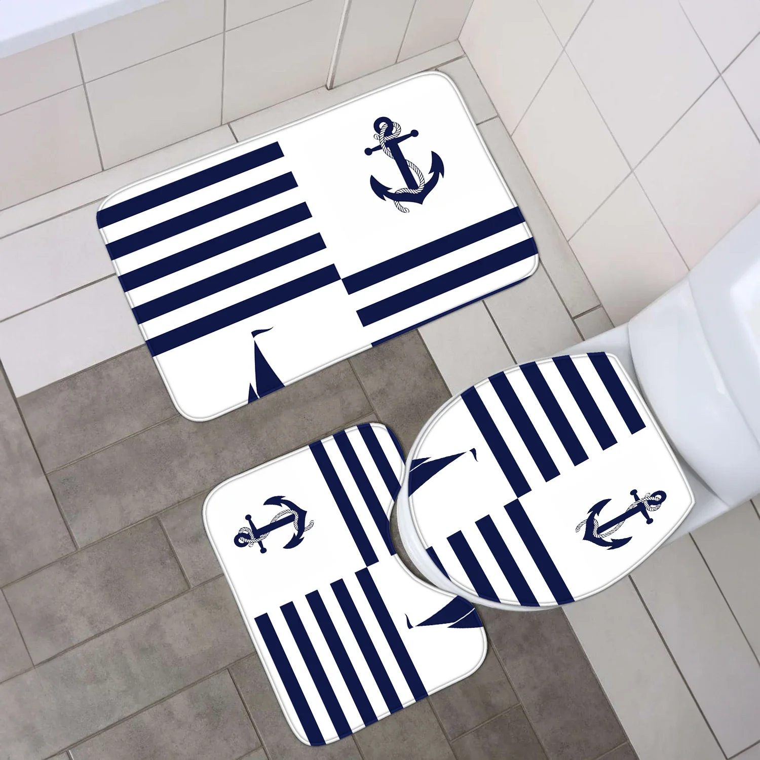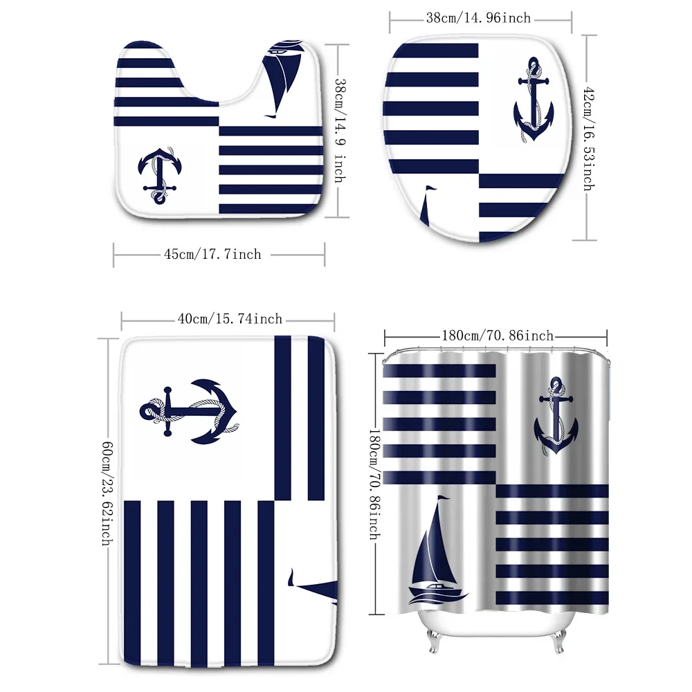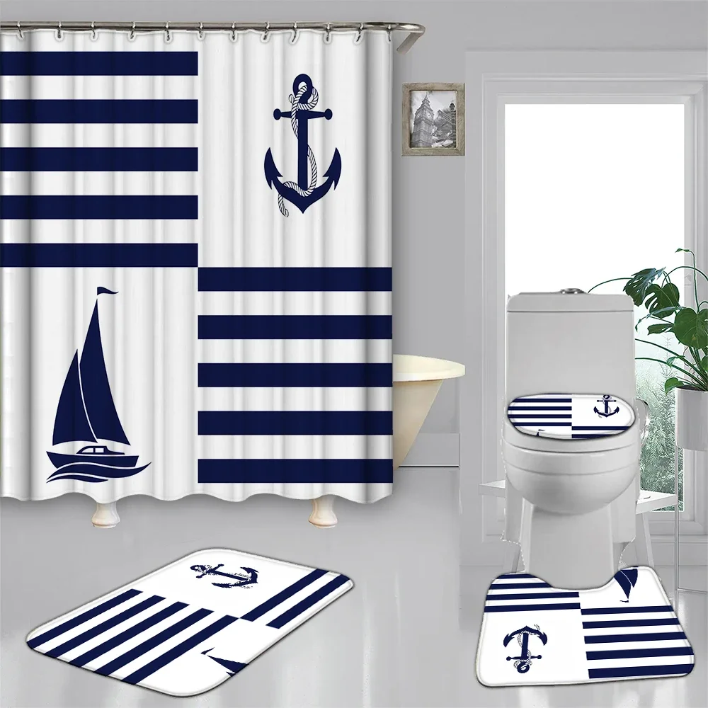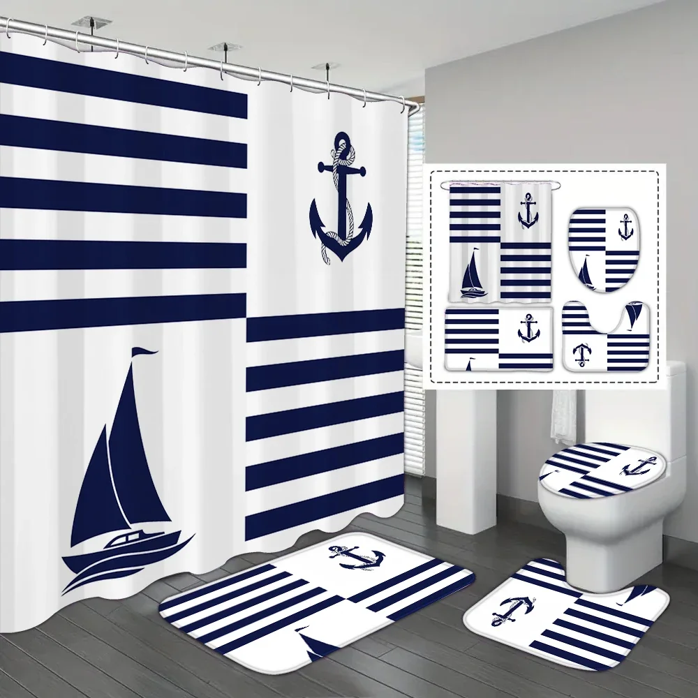 Juego de 4 piezas de cortina de ducha impermeable con 12 ganchos y estampado oceánico de timón para velero, alfombrilla para el suelo del baño, alfombrilla en forma de U